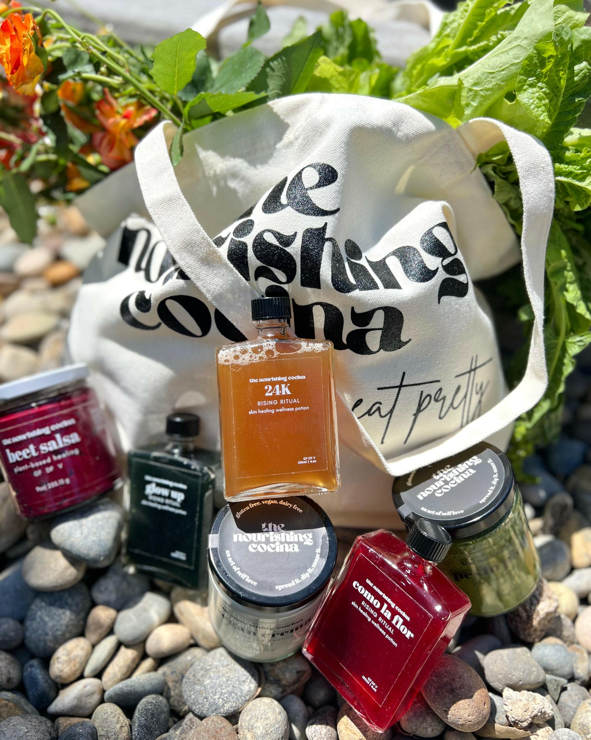 A variety bundle of our plant-based healing sauces & wellness potions including the farmers market tote bag!